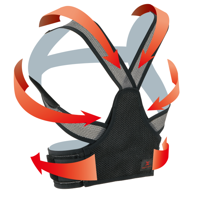 上体を起こす上部クロスと腹圧を高める下部のクロスが正しい姿勢をサポート。